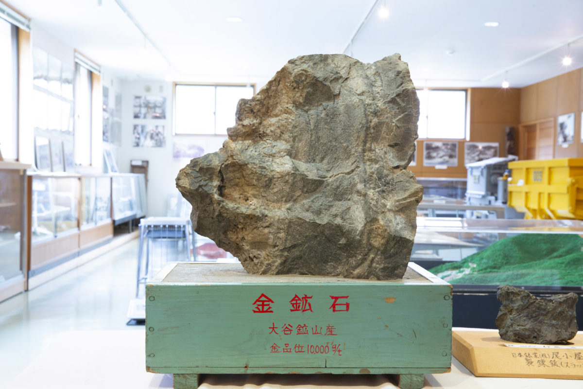 大谷矿山开采出的金矿石。北上山地南部地区出产的天然金块有个特点,就是附着在矿石上的金粒用肉眼就可以识别,易于发现。这块金矿石也同样很容易地找到其中的金粒,可以说以砂金开采为始的采金事业能够如此普及就是因为“陆奥黄金”的这些特点。