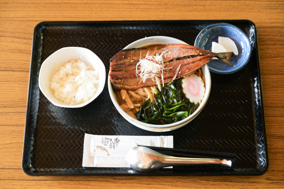 这是一款使用大船渡产秋刀鱼制作的当地特色拉面,在市内多家合作店铺均有供应。在其发源地——碁石海岸餐厅小屋,这是备受喜爱的人气菜品。地道的吃法是,一边将 “秋刀鱼味醂鱼干”缓缓搅散,一边品尝其风味的变化。
